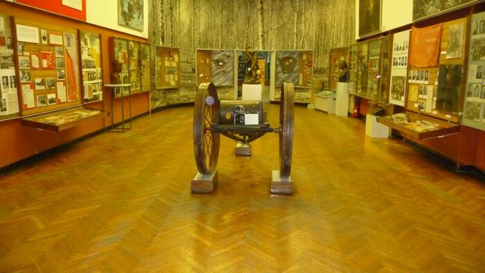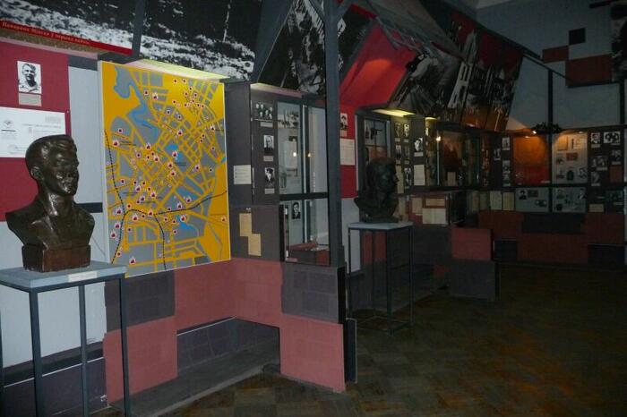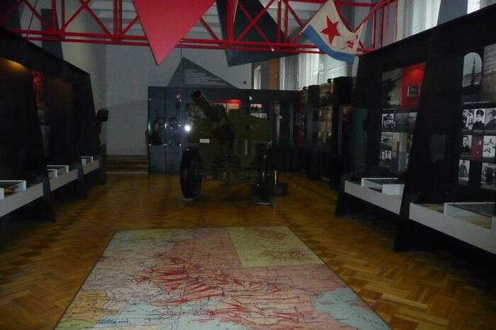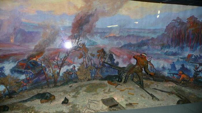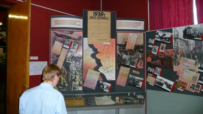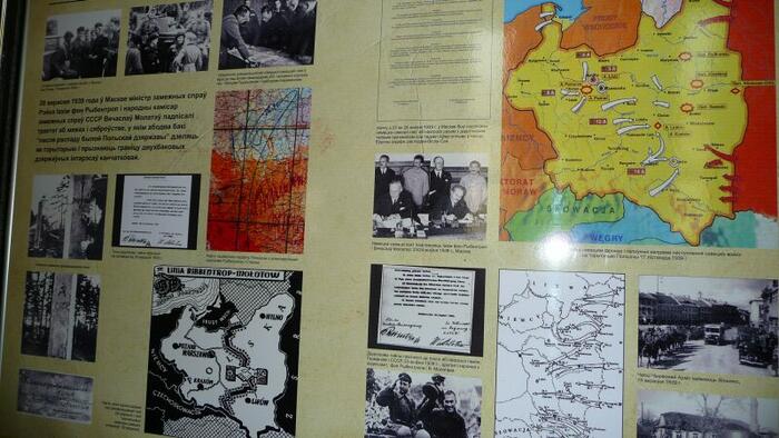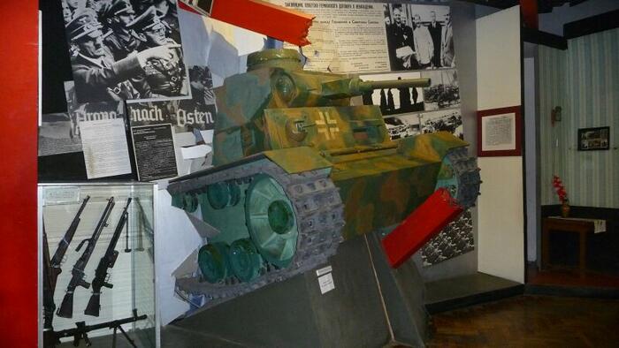 Spacerując po głównej ulicy (Prospekt Niepodległości) dojdziemy do Placu Październikowego (od rewolucji październikowej) i tam w samym rogu znajduje się Muzeum Wielkiej Wojny Ojczyźnianej 1941-1945. Muzeum powstało w latach sześćdziesiątych. Jest ono obecnie przebudowywane, więc niestety nie można obejrzeć ekspozycji zewnętrznej, ale warto zerknąć do środka. Po zakupie biletu wchodzimy do pierwszej Sali. A tu zaskoczenie, ekspozycja poświęcona ... zbrodni Katyńskiej. Na kilkunastu tablicach przedstawiono samą zbrodnię, jej przebieg i kulisy. Ekspozycja przygotowana przy udziale Polski. Następnie wchodzimy do sal muzealnych. Ekspozycja ułożona jest chronologicznie i rozpoczyna się od 1939 roku. Również i tu (podobnie jak w Brześciu) pokazany jest napad obu okupantów na Polskę. Potem atak Niemiec na Związek Sowiecki w 1941 roku i dalsze koleje wojny. W ekspozycji znajdziemy także akcenty polskie. W części poświęconej ruchom partyzanckim kilka gablot prezentuje polski ruch partyzancki, ze szczególnym uwzględnieniem Armii Krajowej. Chociaż sama ekspozycja była przygotowywana dawno, jest ona dosyć interesująca i dzięki wielu dioramom zwiedza się ją z wielką przyjemnością. Zwiedzanie kończymy w salach prezentujących sztukę współczesną (dla nas „zielonych" to może niezbyt interesujące).