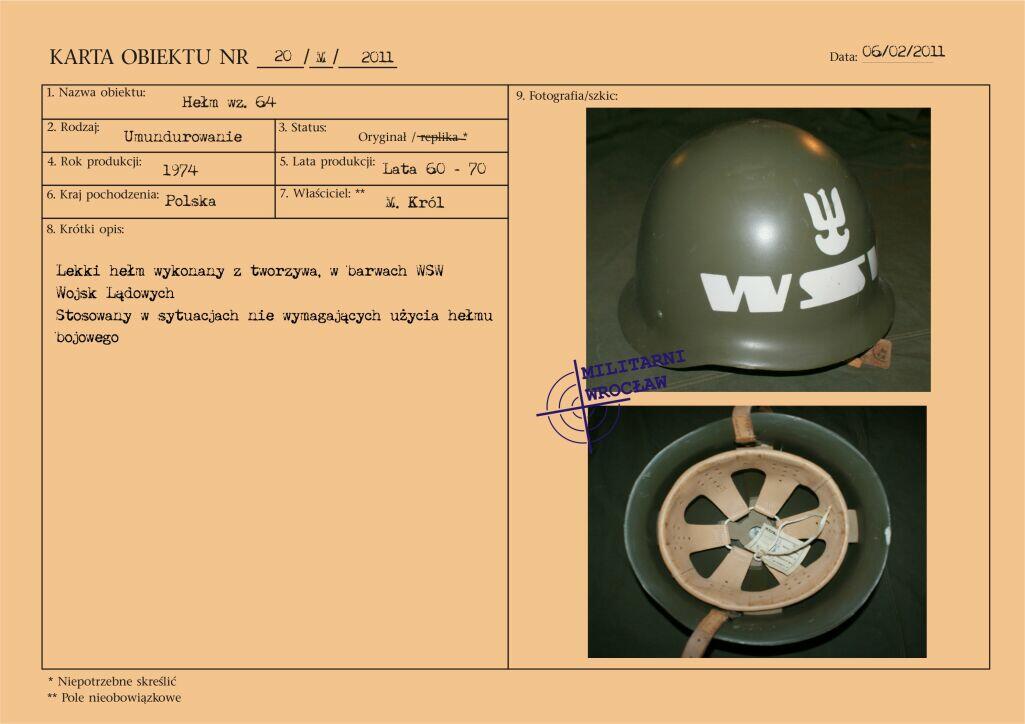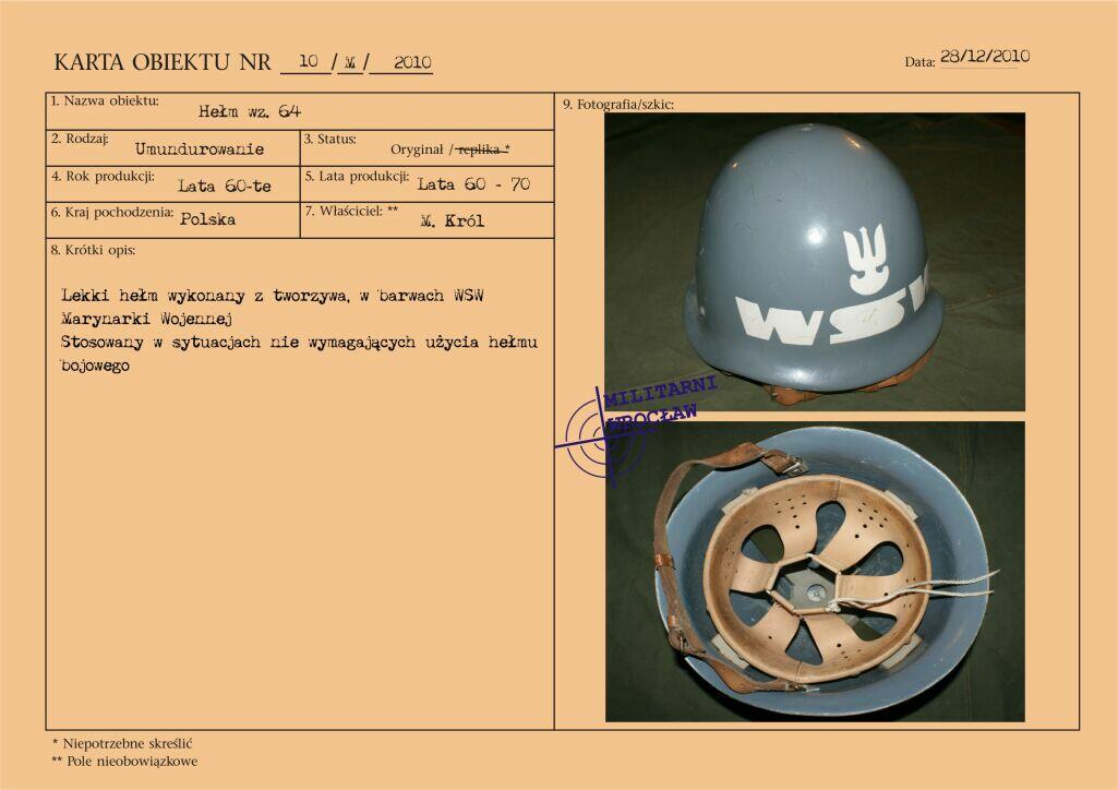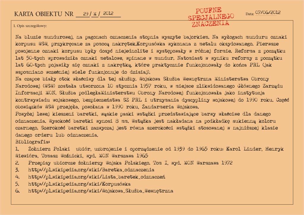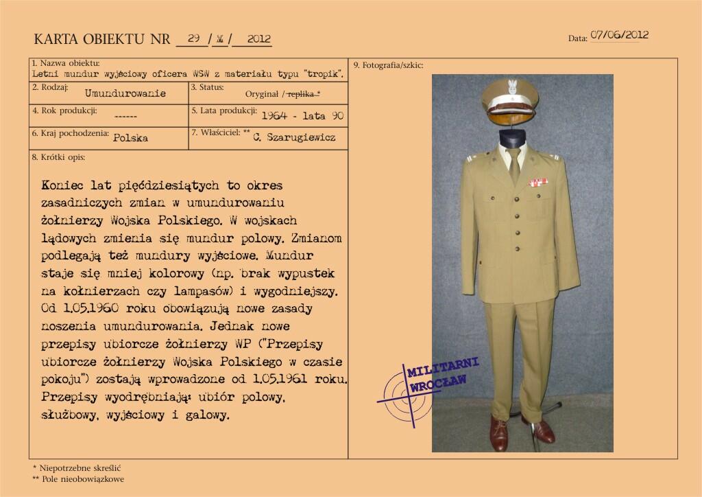 Letni mundur majora Wojskowej Służby Wewnętrznej, z materiału typu „tropik". Na wyłogach munduru oznaki korpusu WSW, przykręcane za pomocą nakrętek. Korpusówka wykonana z metalu oksydowanego. Pierwsze powojenne oznaki korpusu były dosyć niejednolite i występowały w różnej formie. Reforma z początku lat 50-tych wprowadziła oznaki metalowe, wpinane w mundur. Natomiast w wyniku reformy z początku lat 60-tych pojawiły się oznaki z nakrętką, które praktycznie funkcjonowały do końca PRL. Biały otok na czapce garnizonowej.