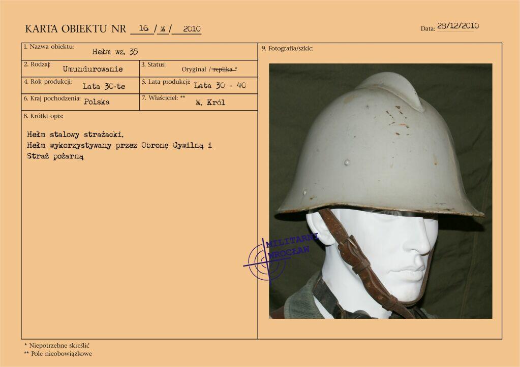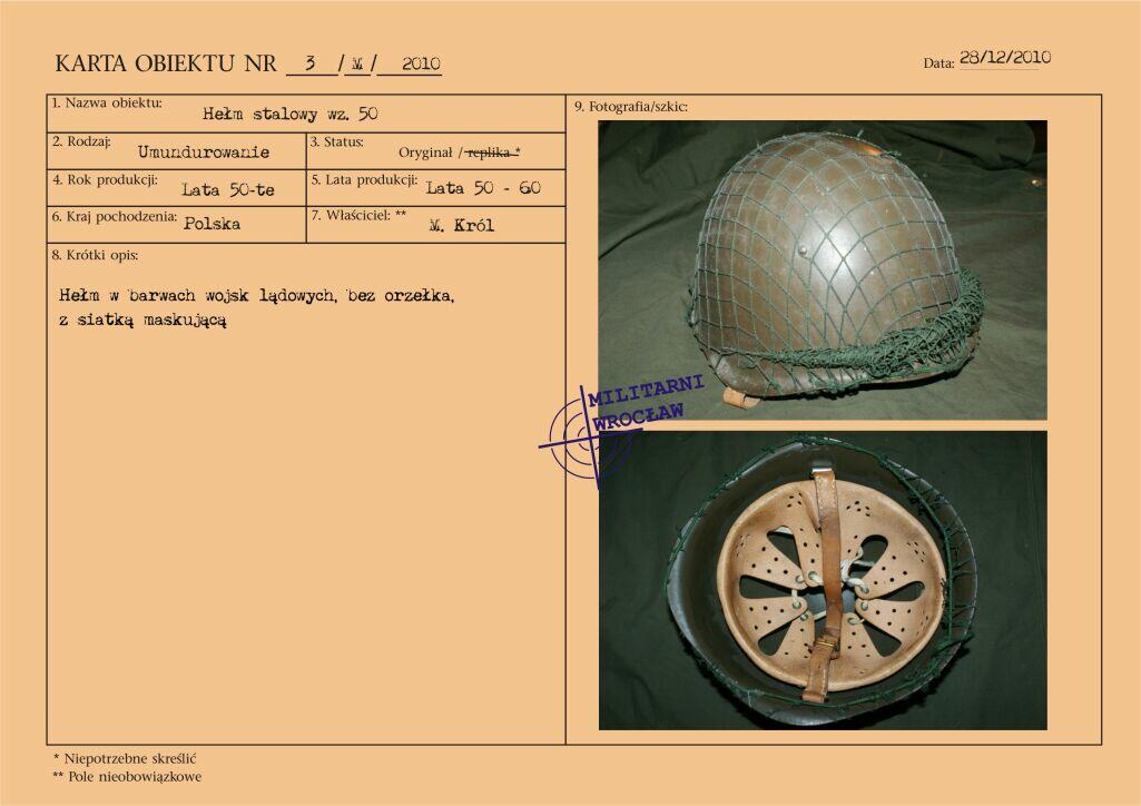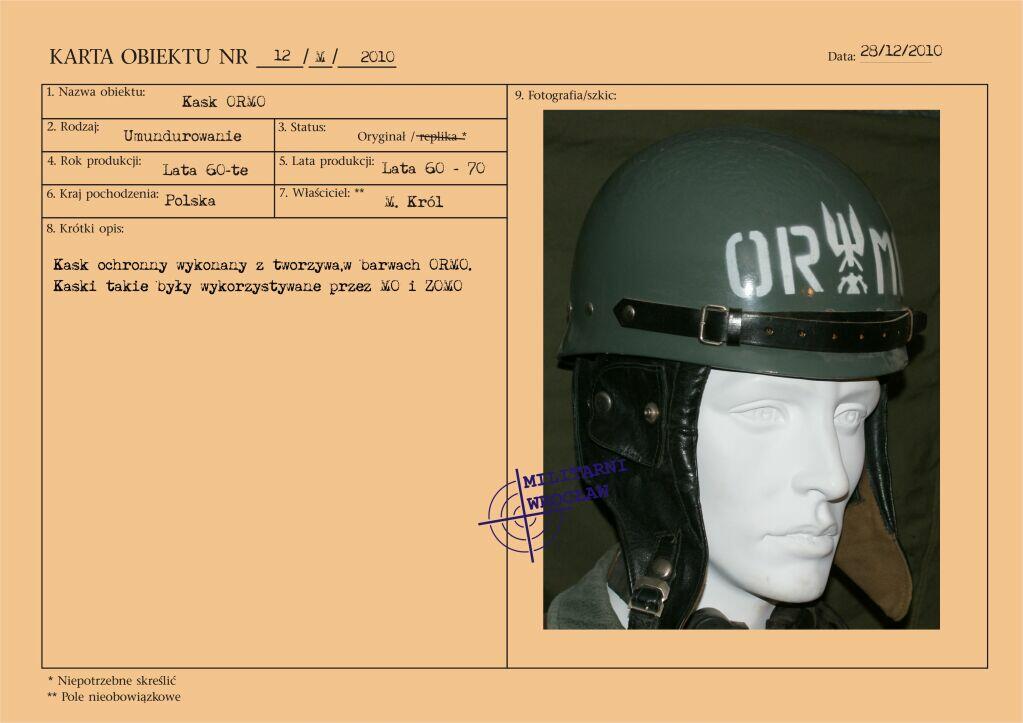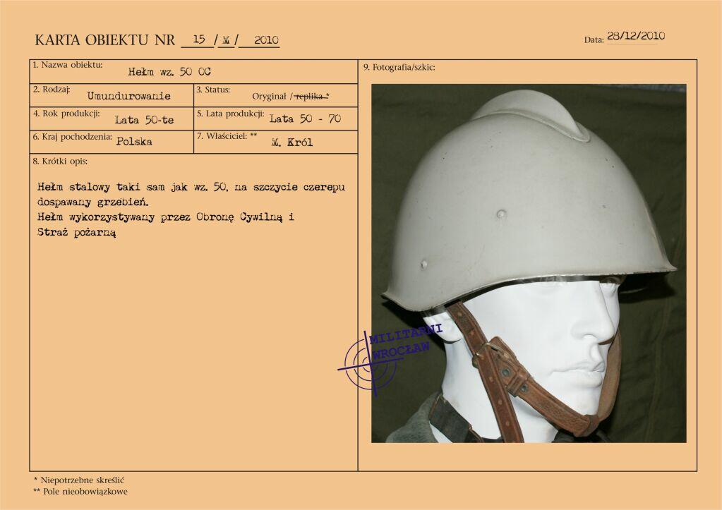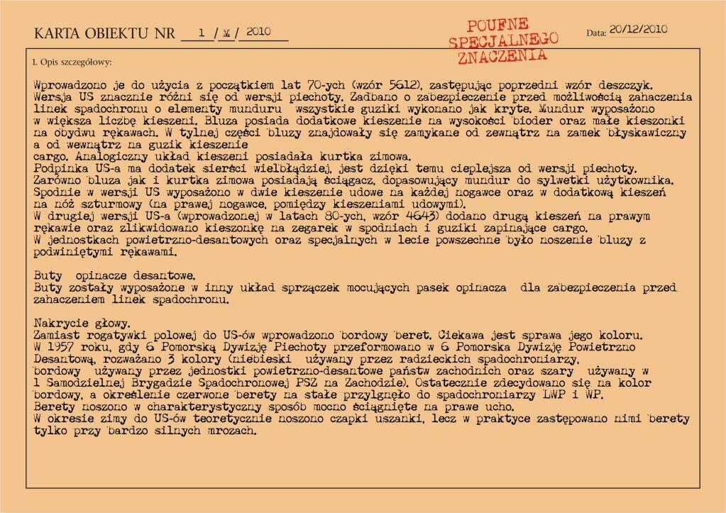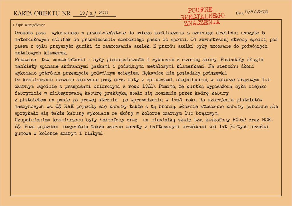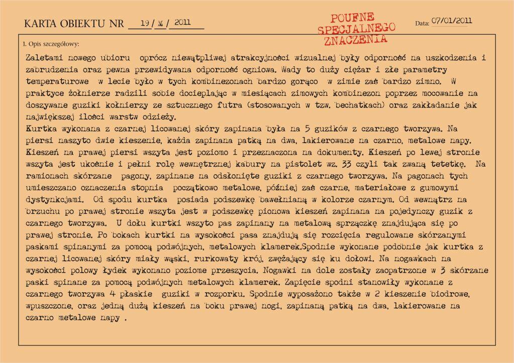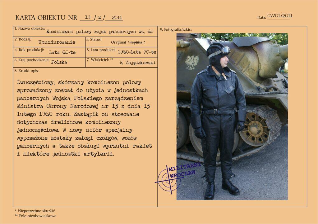 Dwuczęściowy, skórzany kombinezon polowy wprowadzony został do użycia w jednostkach pancernych Wojska Polskiego zarządzeniem Ministra Obrony Narodowej nr 13 z dnia 13 lutego 1960 roku. Zastąpił on stosowane dotychczas drelichowe kombinezony jednoczęściowe.