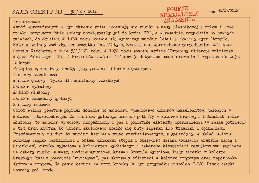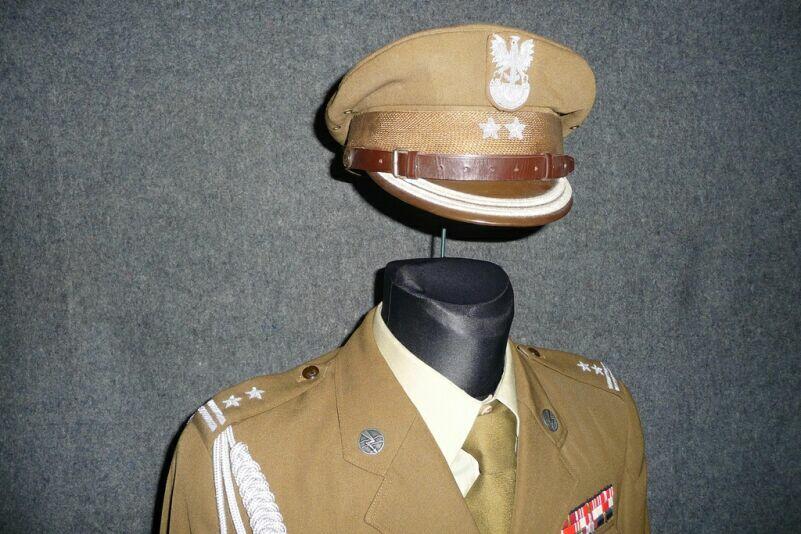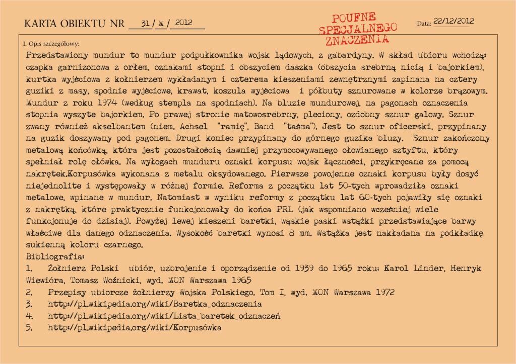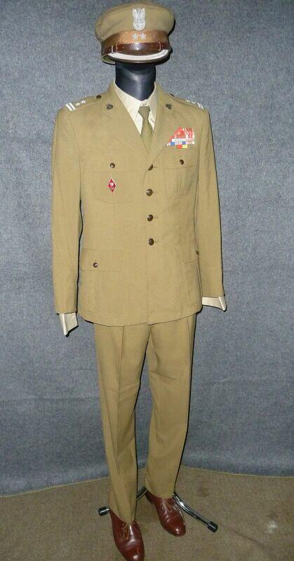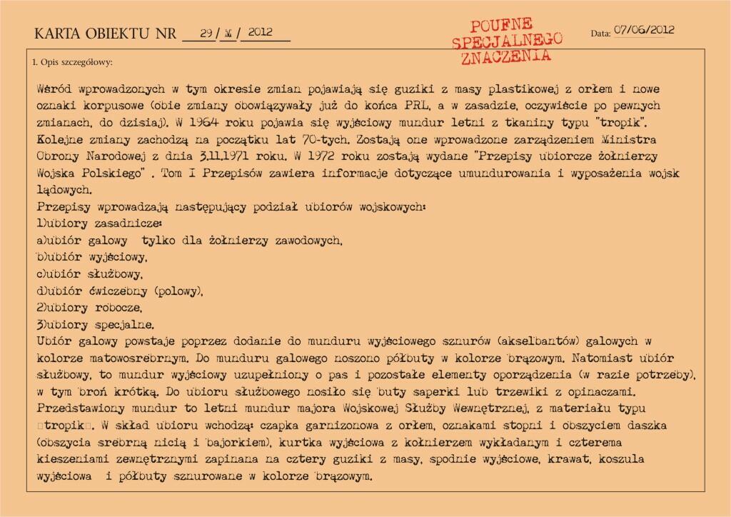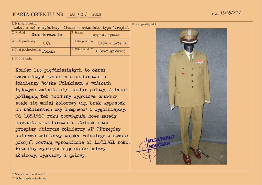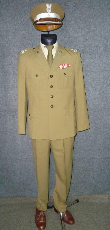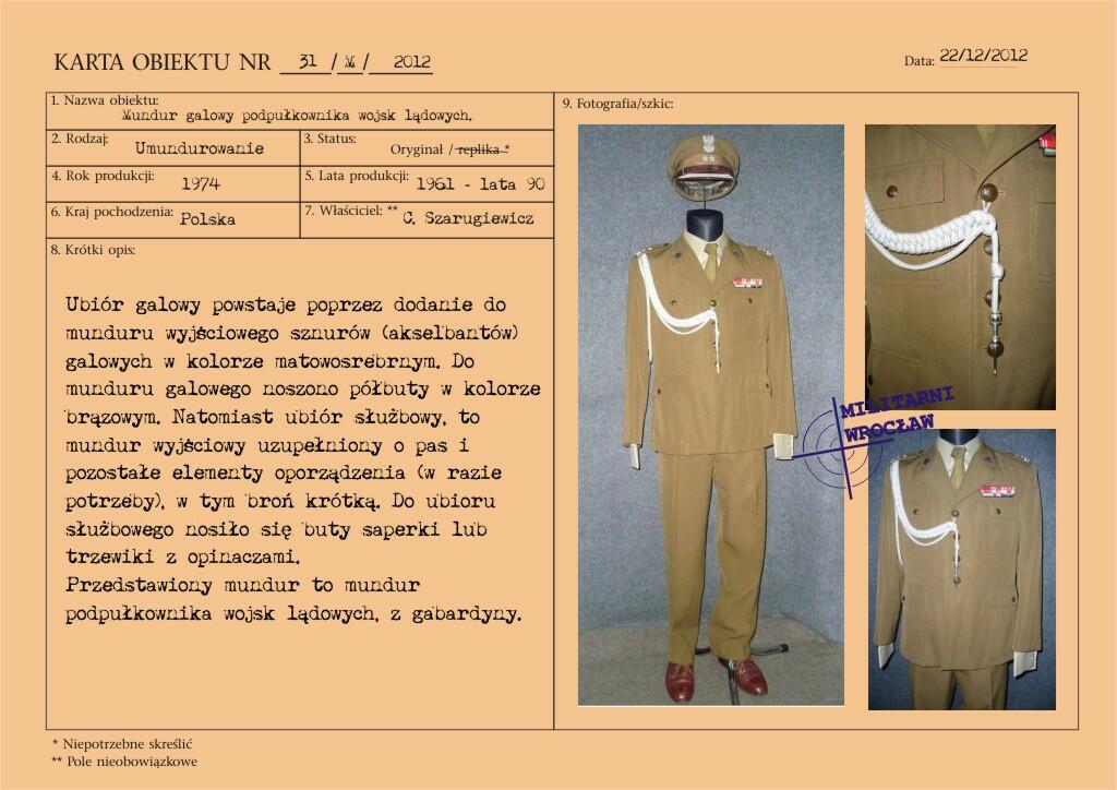 Przedstawiony mundur to mundur podpułkownika wojsk lądowych, z gabardyny. W skład ubioru wchodzą: czapka garnizonowa z orłem, oznakami stopni i obszyciem daszka (obszycia srebrną nicią i bajorkiem), kurtka wyjściowa z kołnierzem wykładanym i czterema kieszeniami zewnętrznymi zapinana na cztery guziki z masy, spodnie wyjściowe, krawat, koszula wyjściowa i półbuty sznurowane w kolorze brązowym. Mundur z roku 1974 (według stempla na spodniach).