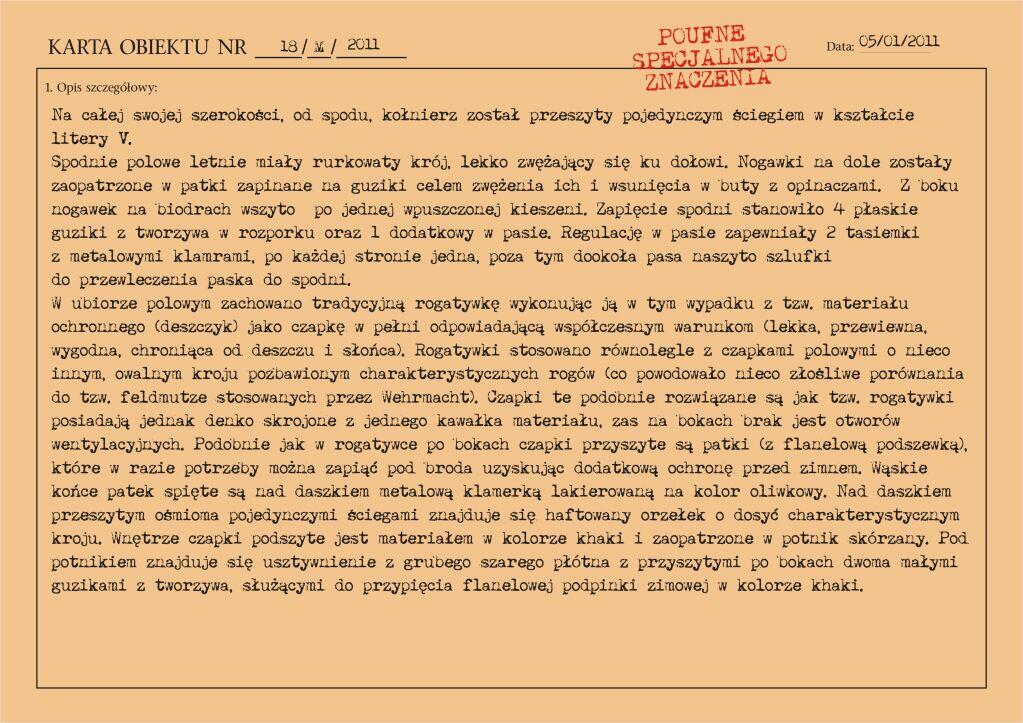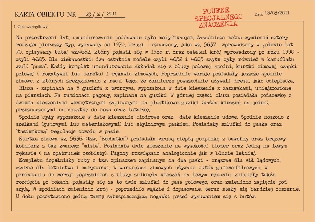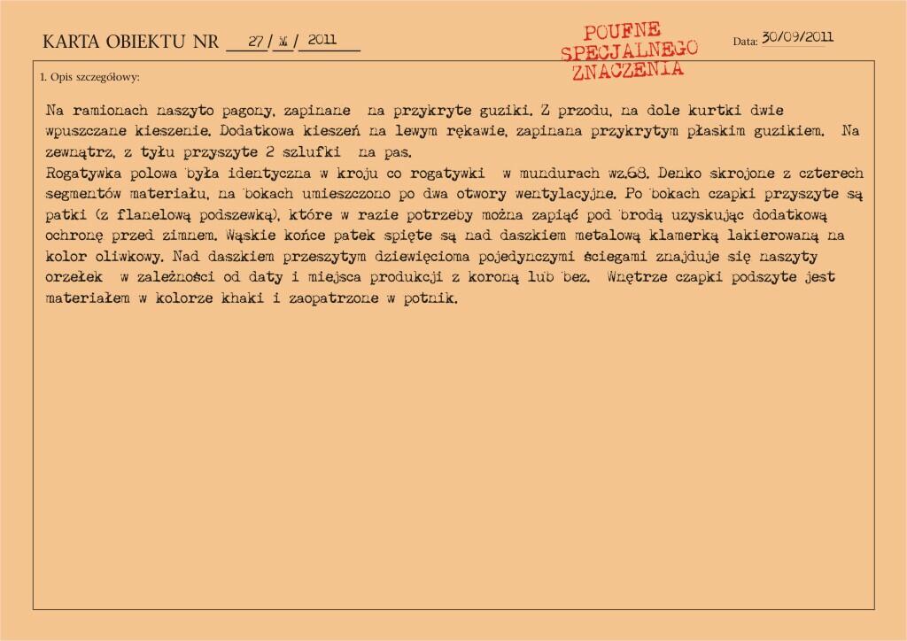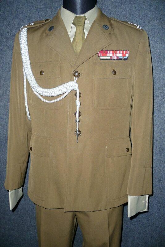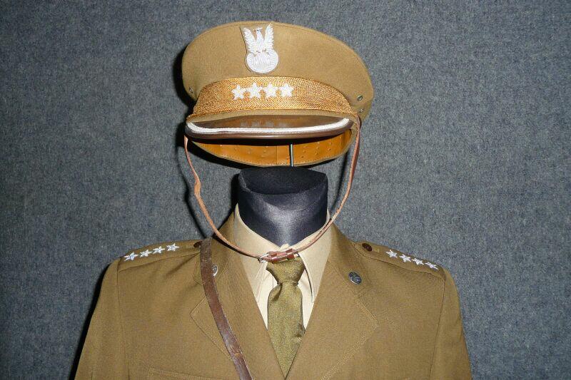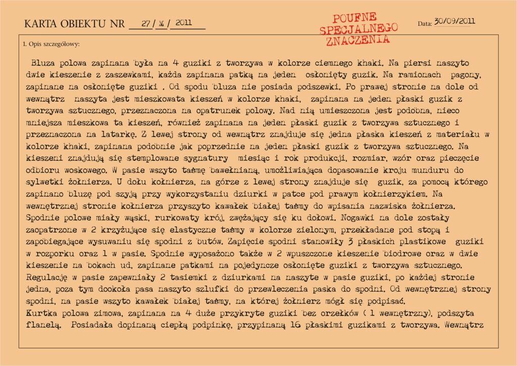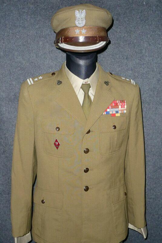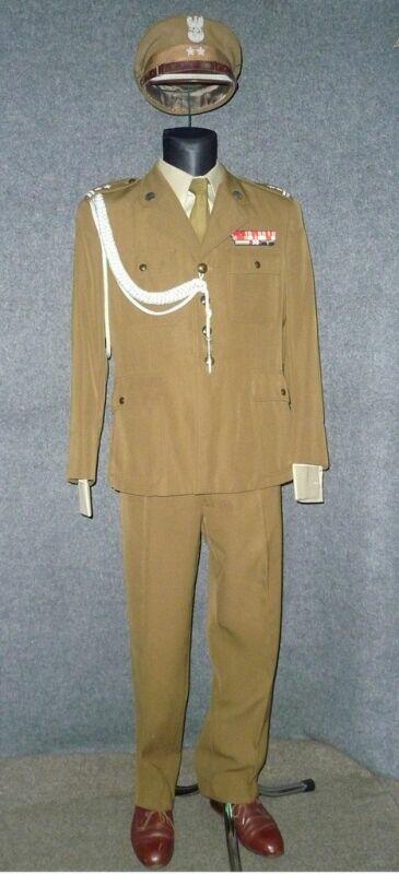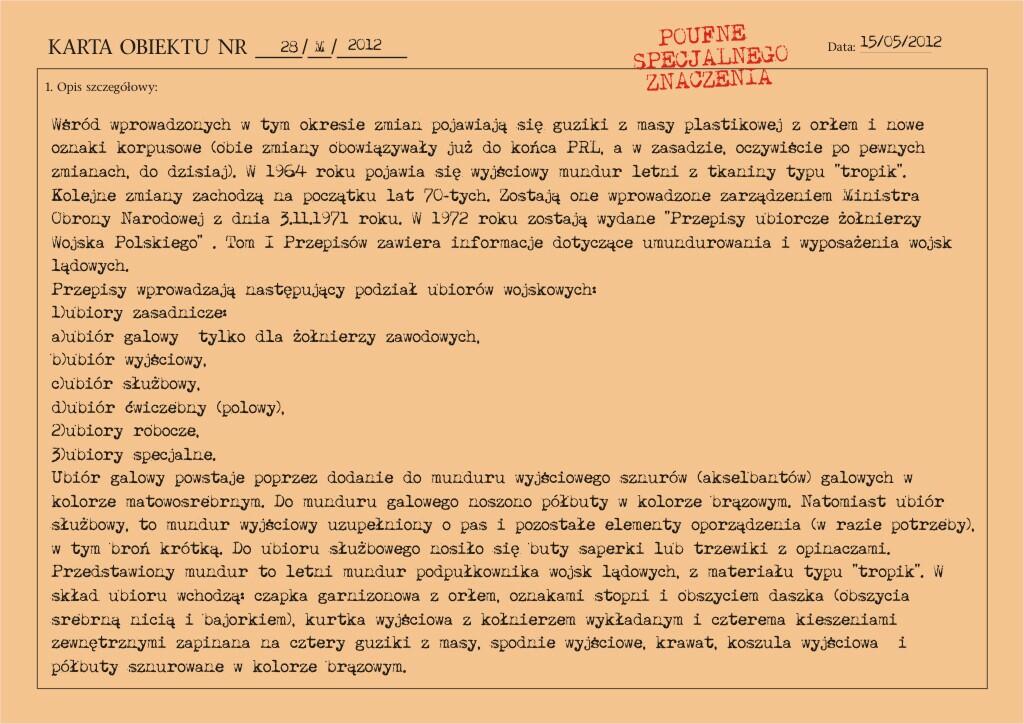 Przedstawiony mundur to mundur podpułkownika wojsk lądowych, z gabardyny. W skład ubioru wchodzą: czapka garnizonowa z orłem, oznakami stopni i obszyciem daszka (obszycia srebrną nicią i bajorkiem), kurtka wyjściowa z kołnierzem wykładanym i czterema kieszeniami zewnętrznymi zapinana na cztery guziki z masy, spodnie wyjściowe, krawat, koszula wyjściowa i półbuty sznurowane w kolorze brązowym. Mundur z roku 1974 (według stempla na spodniach).