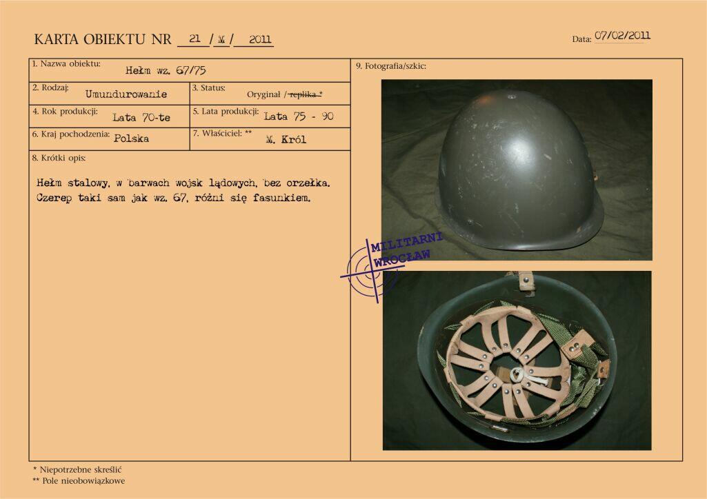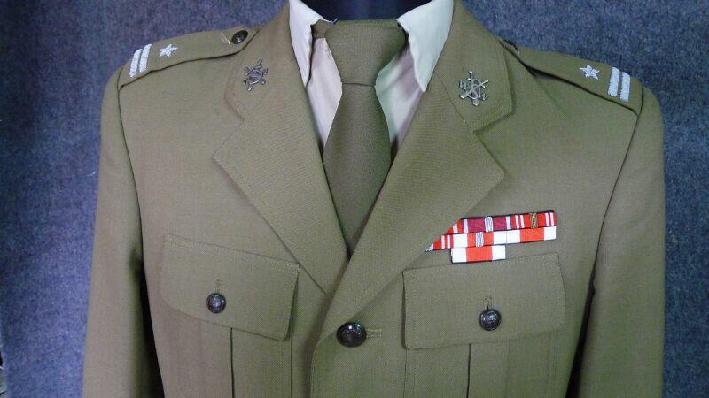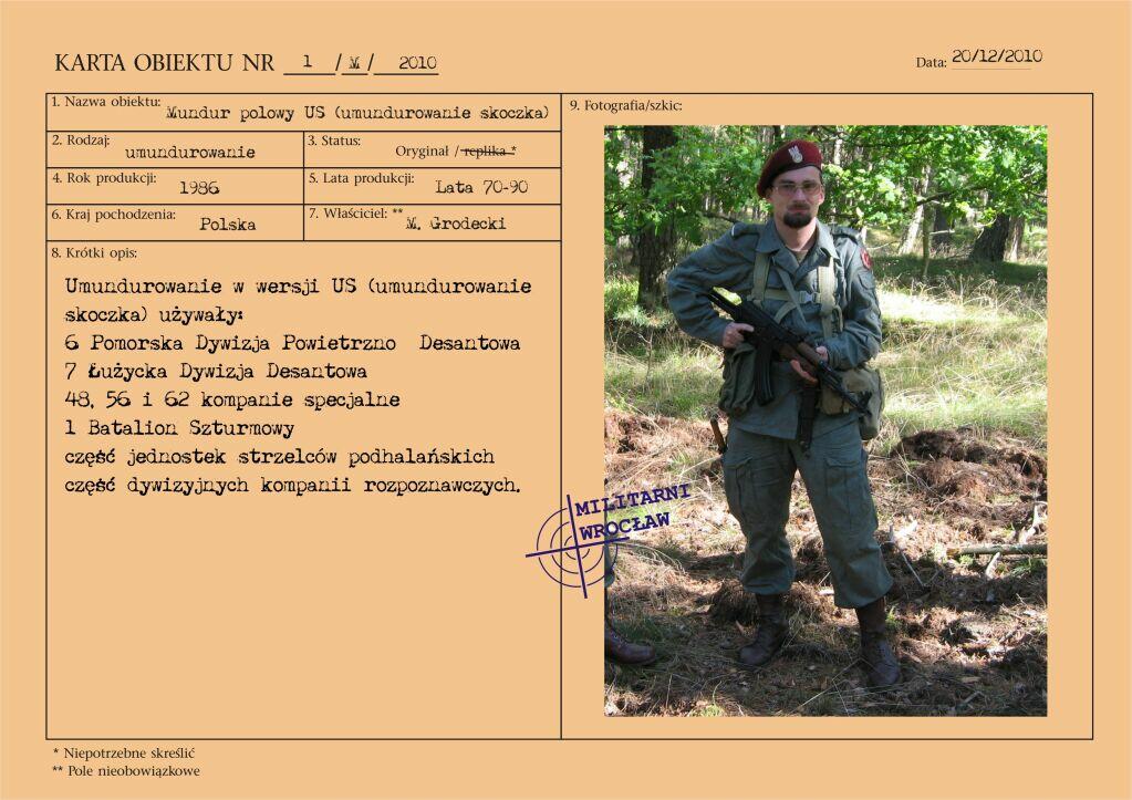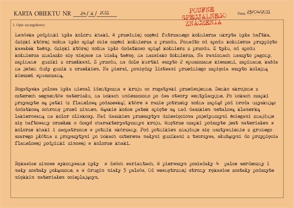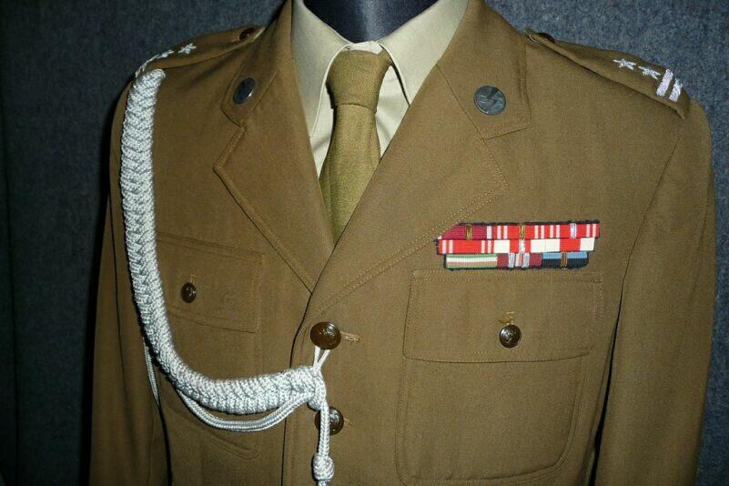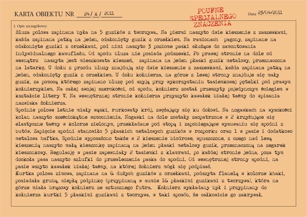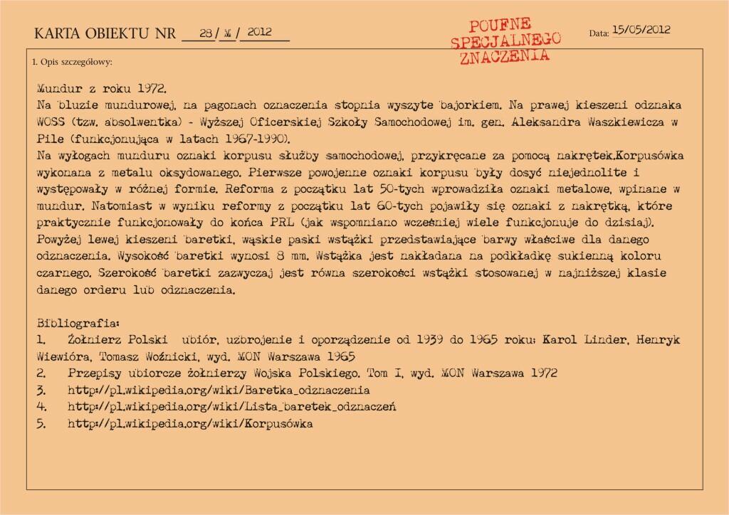 Przedstawiony mundur to mundur podpułkownika wojsk lądowych, z gabardyny. W skład ubioru wchodzą: czapka garnizonowa z orłem, oznakami stopni i obszyciem daszka (obszycia srebrną nicią i bajorkiem), kurtka wyjściowa z kołnierzem wykładanym i czterema kieszeniami zewnętrznymi zapinana na cztery guziki z masy, spodnie wyjściowe, krawat, koszula wyjściowa i półbuty sznurowane w kolorze brązowym. Mundur z roku 1974 (według stempla na spodniach).