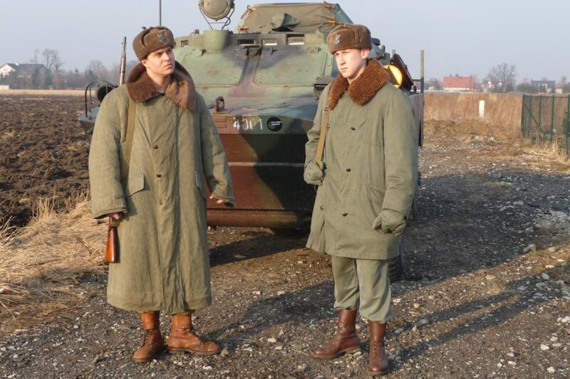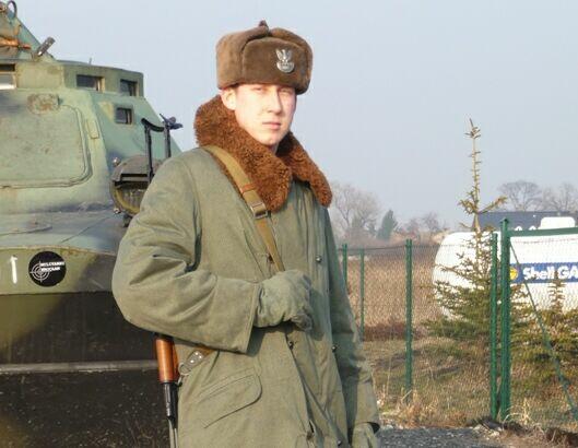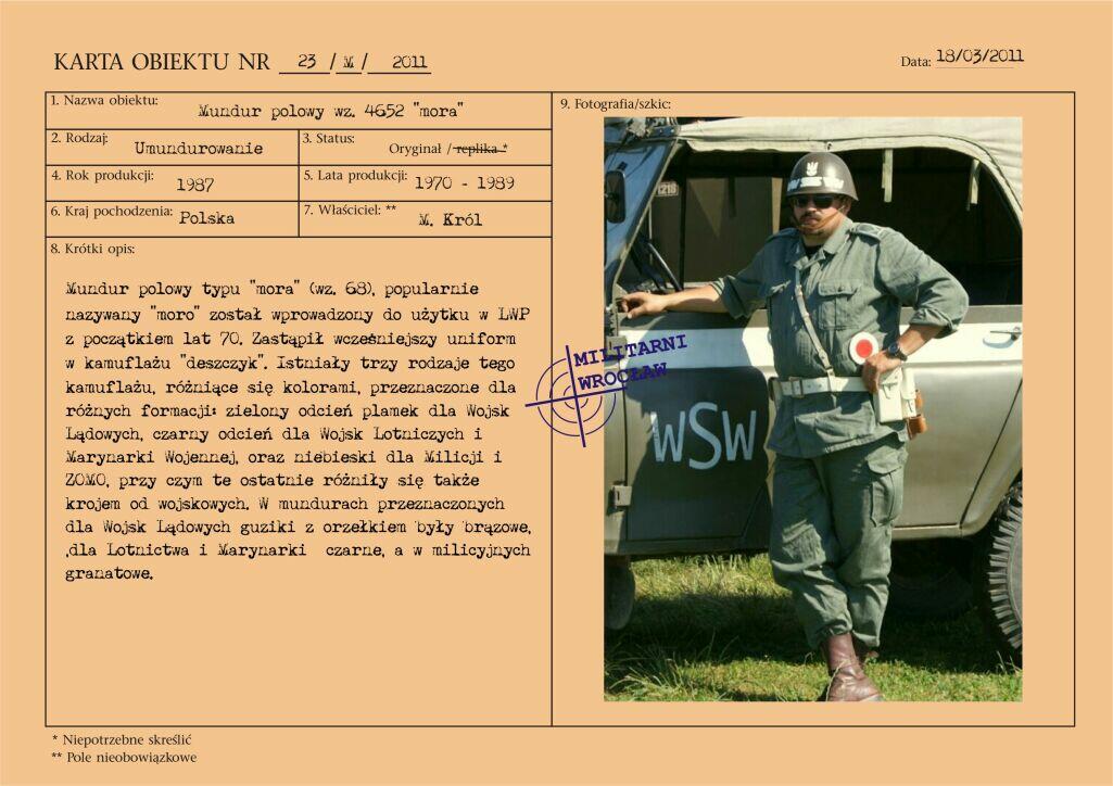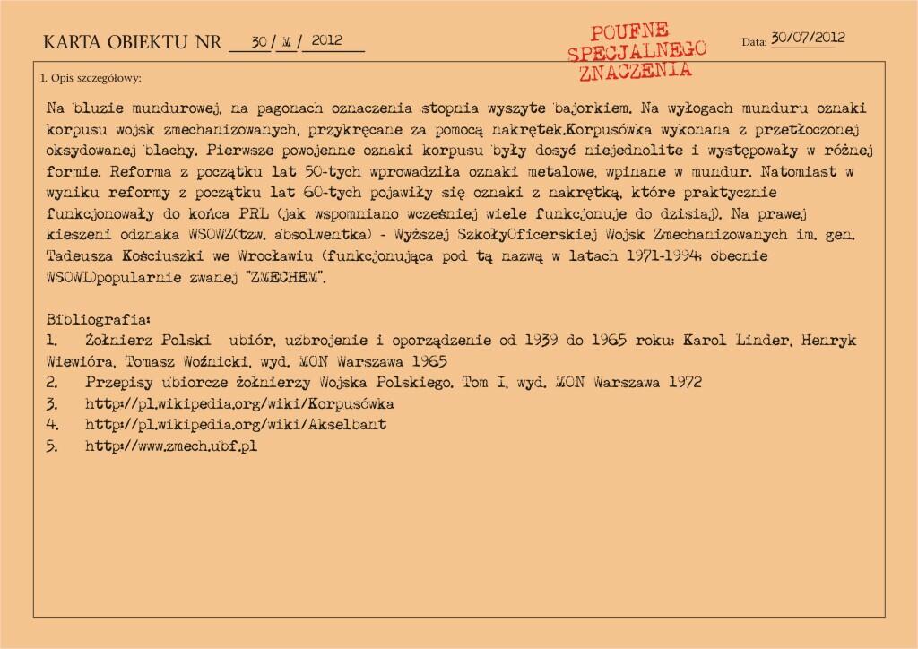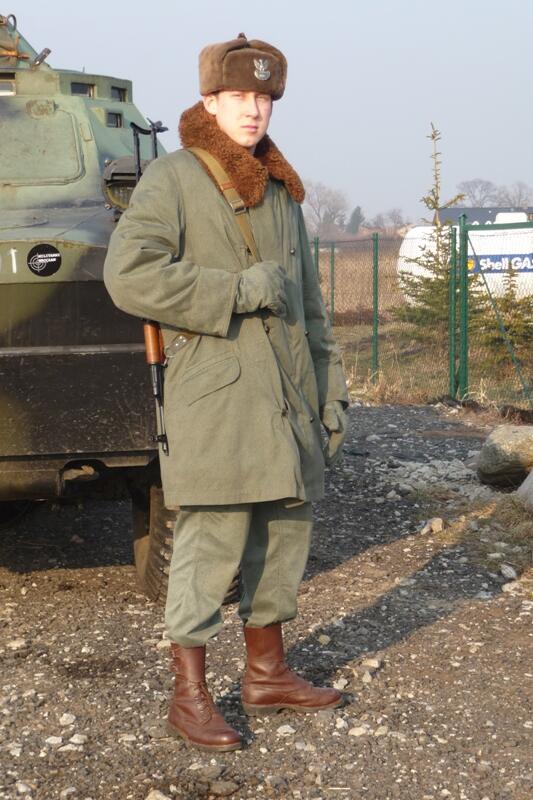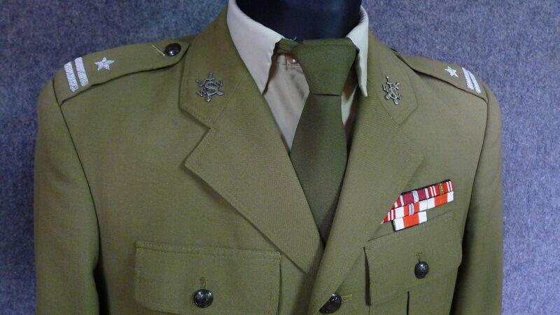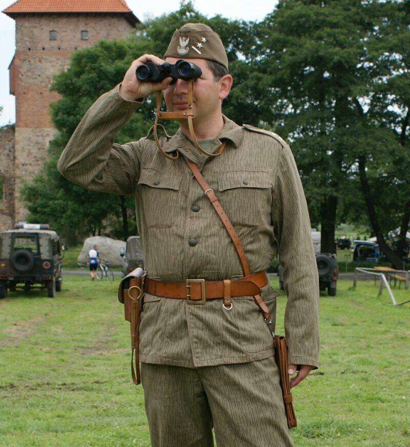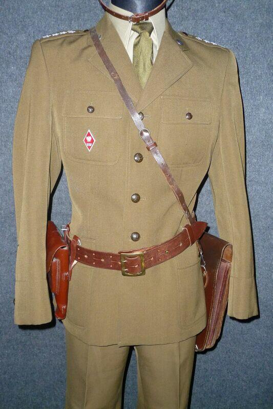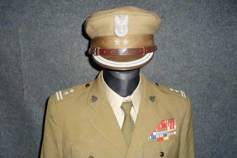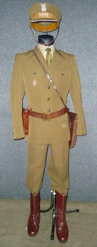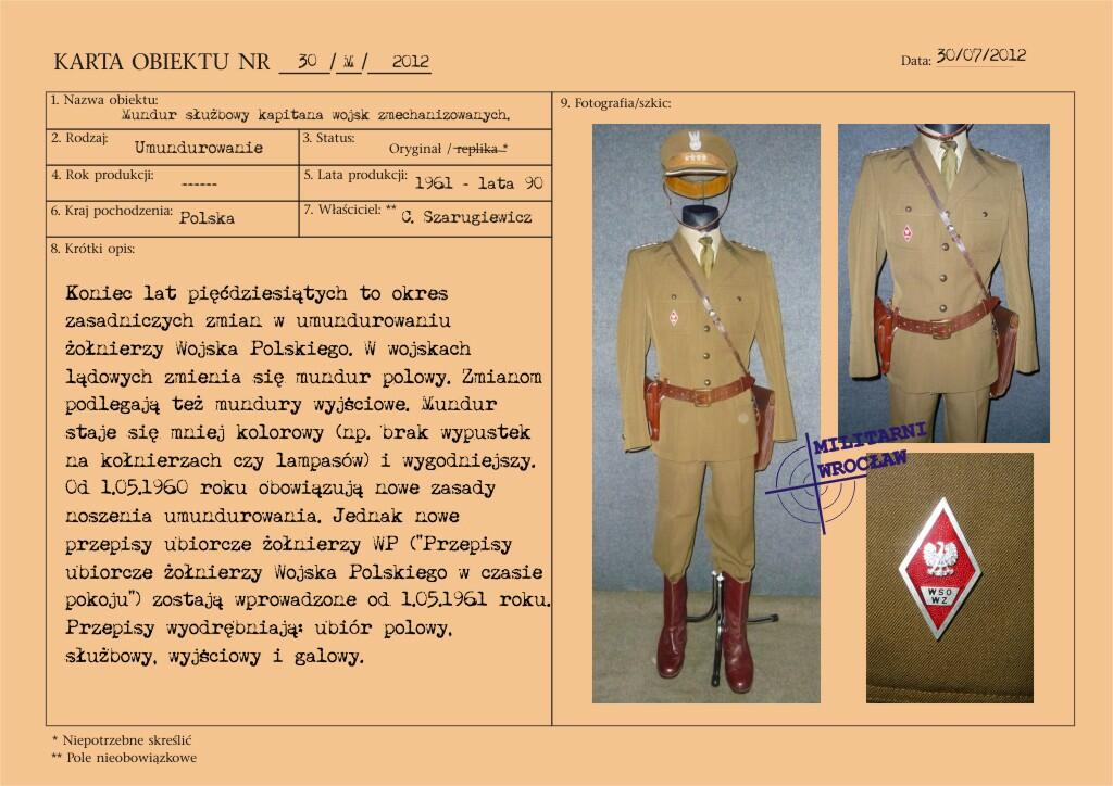 Mundur kapitana wojsk zmechanizowanych, z gabardyny. W skład ubioru wchodzą: czapka garnizonowa, kurtka wyjściowa z kołnierzem wykładanym i czterema kieszeniami zewnętrznymi, spodnie wyjściowe, krawat, koszula wyjściowa, buty saperki w kolorze brązowym (zwane potocznie „rumcajsami"), pas skórzany oficerski w kolorze brązowym oraz raportówka skórzana brązowa. Na pasie kabura na broń krótką (w tym przypadku pistolet P-64). Pasek czapki noszony pod brodą.