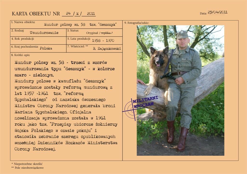 Mundur polowy wz. 58 - trzeci z wzorów umundurowania typu "deszczyk" - w kolorze szaro - zielonym. Mundury polowe w kamuflażu "deszczyk" wprowadzone zostały reformą mundurową z lat 1957 -1961 tzw. "reformą Spychalskiego"