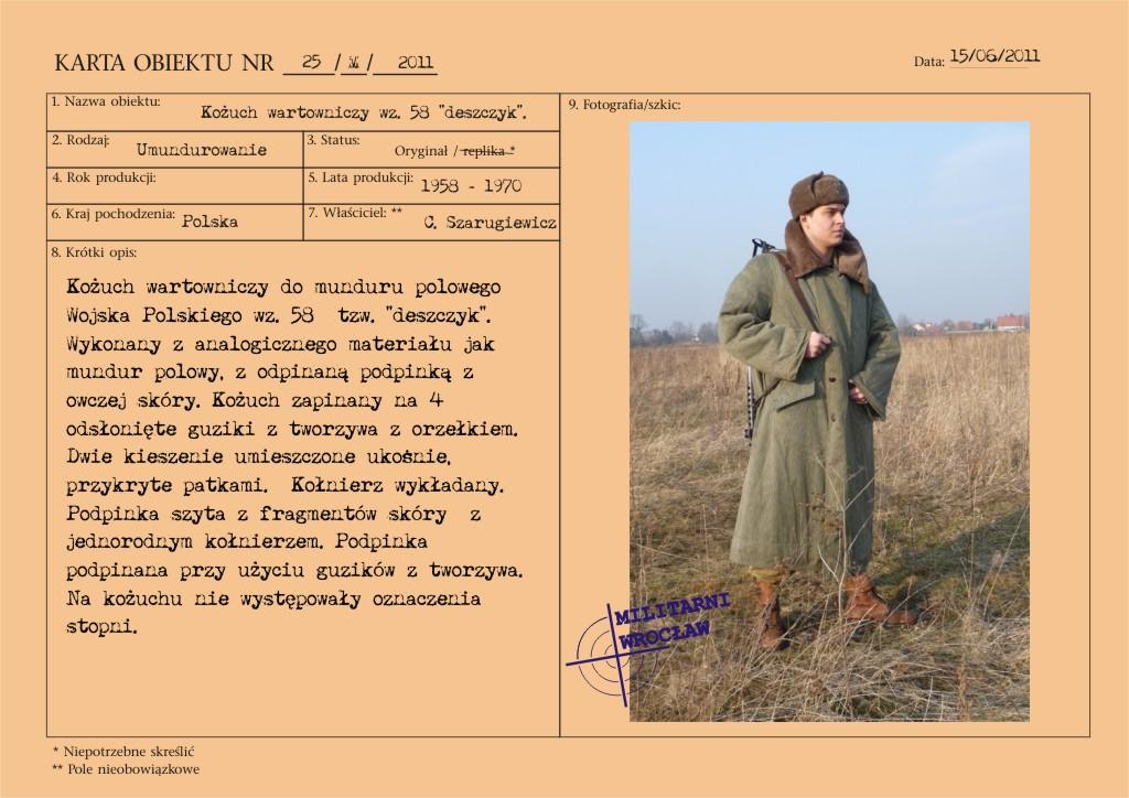 Kożuch wartowniczy do munduru polowego Wojska Polskiego wz. 58 – tzw. „deszczyk". Wykonany z analogicznego materiału jak mundur polowy, z odpinaną podpinką z owczej skóry. Kożuch zapinany na 4 odsłonięte guziki z tworzywa z orzełkiem. Dwie kieszenie umieszczone ukośnie, przykryte patkami.