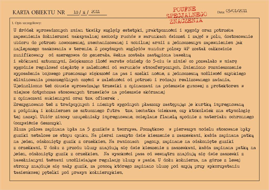 Koniec lat pięćdziesiątych to okres zasadniczych zmian w umundurowaniu żołnierzy Wojska Polskiego. W wojskach lądowych zmienia się mundur polowy. Zmianom podlegają też mundury wyjściowe. Mundur staje się mniej kolorowy (np. brak wypustek na kołnierzach czy lampasów) i wygodniejszy. Od 1.05.1960 roku obowiązują nowe zasady noszenia umundurowania. Jednak nowe przepisy ubiorcze żołnierzy WP zostają wprowadzone od 1.05.1961 roku.
