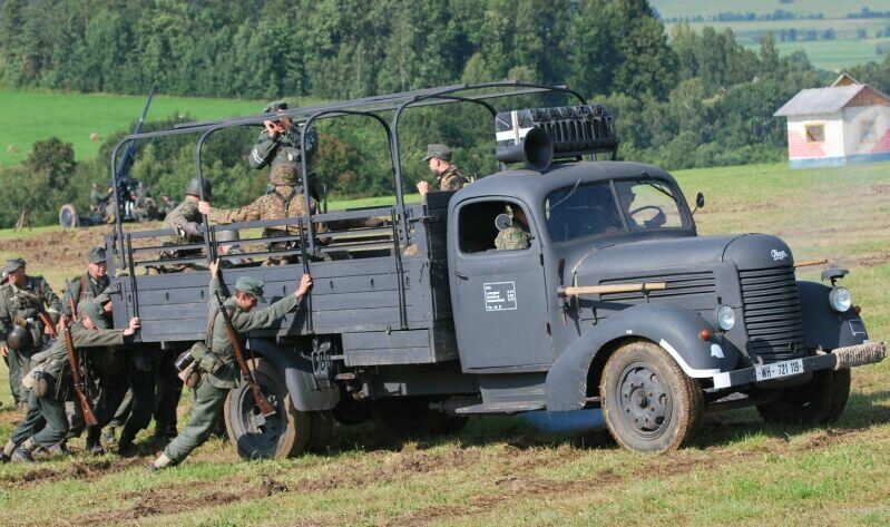 8. Prawie jak na froncie. Po krótkiej, ale intensywnej burzy niektórym pojazdom trzeba był pomagać wydostać się z grząskiego gruntu. Tu trzeba było pomagać ciężarówce Praga RN.