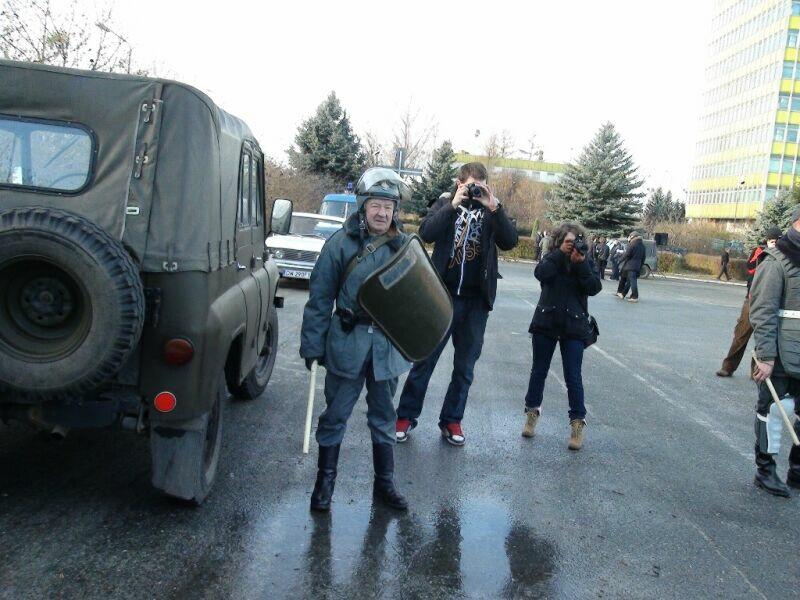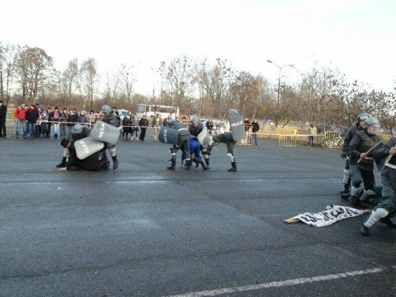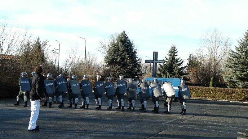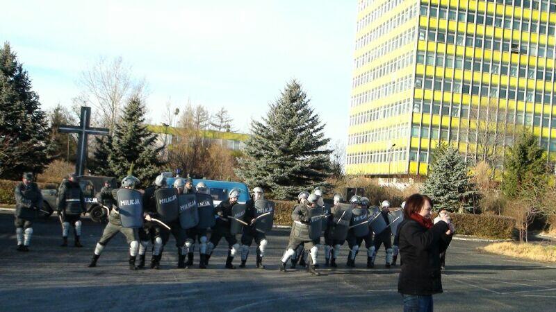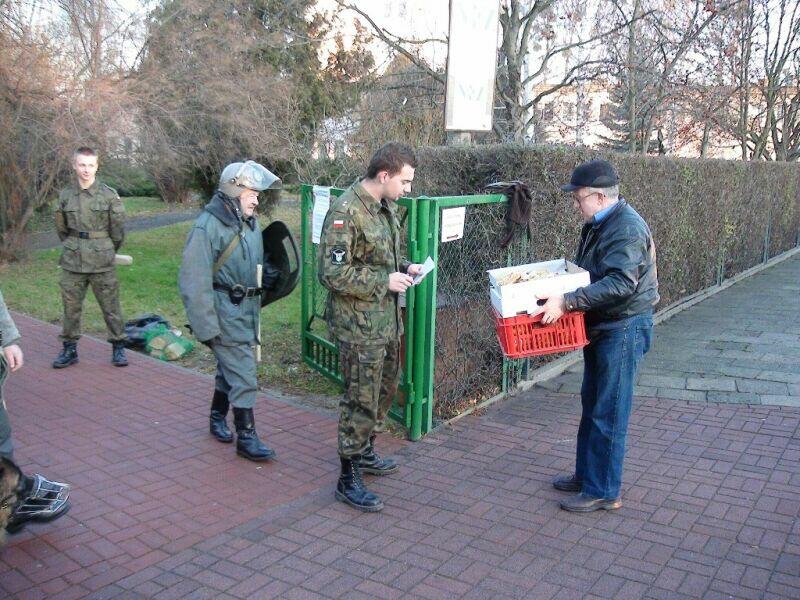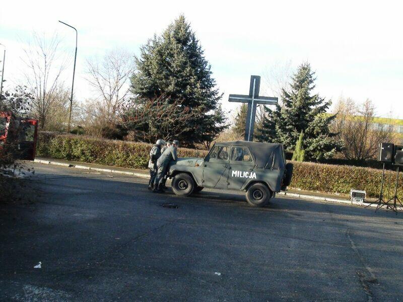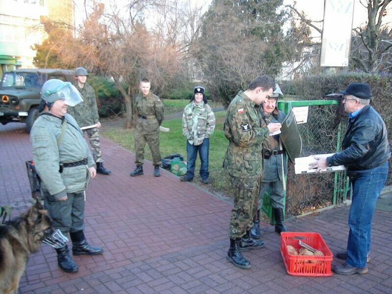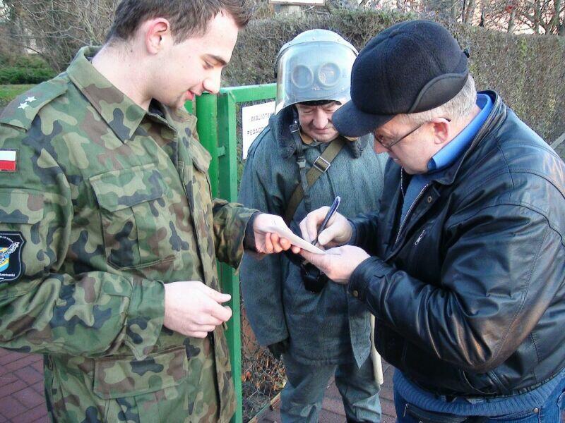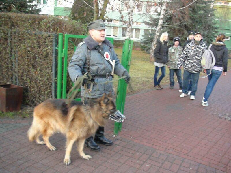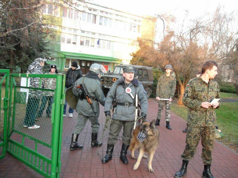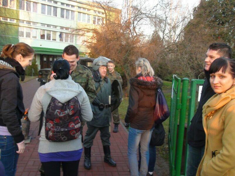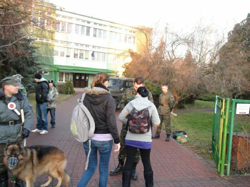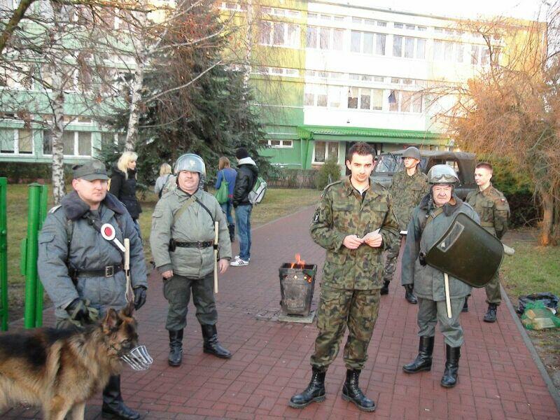 W ten wtorkowy poranek młodzież uczęszczająca do Zespołu Szkół Ponadgimnazjalnych nr 1 w Oławie na swojej drodze do szkoły natknęła się na niecodzienny widok.... Na szkolnym chodniku stał UAZ-469B, a obok niego stało trzech panów w historycznych mundurach milicyjnych w towarzystwie psa – pięknego owczarka niemieckiego.... Cóż tu się dzieje? Zapewne nie jedna osoba zadała sobie takie pytanie, a gdy jeszcze panowie zaczęli legitymować uczniów, zdziwienie było coraz większe. Na szczęście, tym razem nic się nie stało, tylko jeden z naszych historycznych patroli Militarnych Wrocław udał się na historyczny rekonesans do szkoły celem przypomnienia młodzieży o rocznicy ogłoszenia stanu wojennego. Mamy nadzieję, że dzięki naszym kolegom młodzież zainteresuje się wydarzeniami sprzed 30 lat.