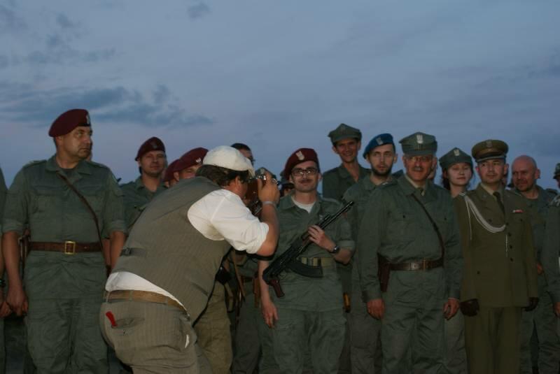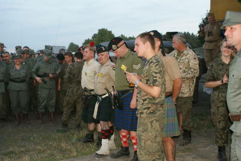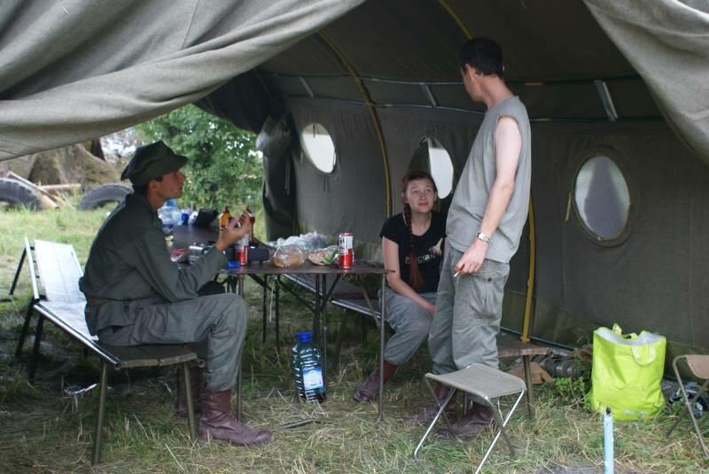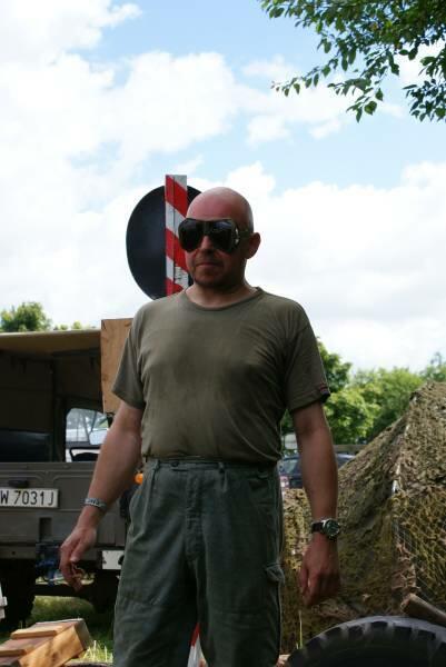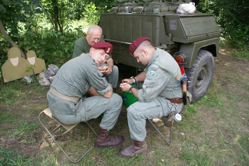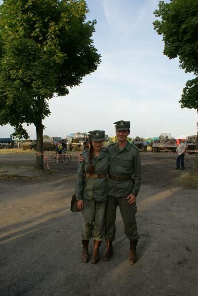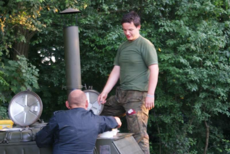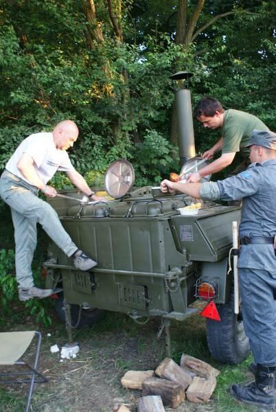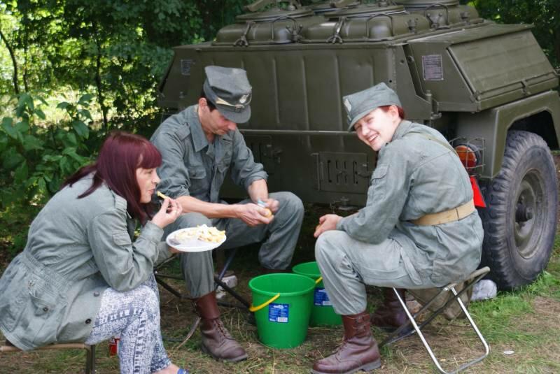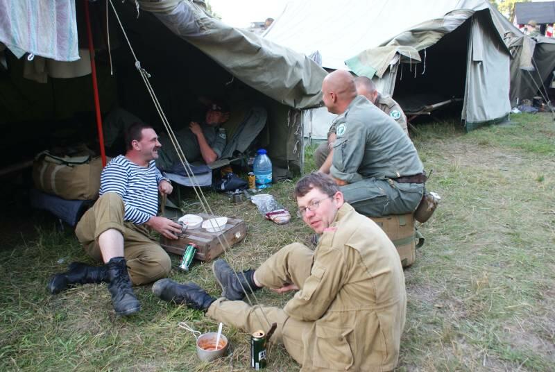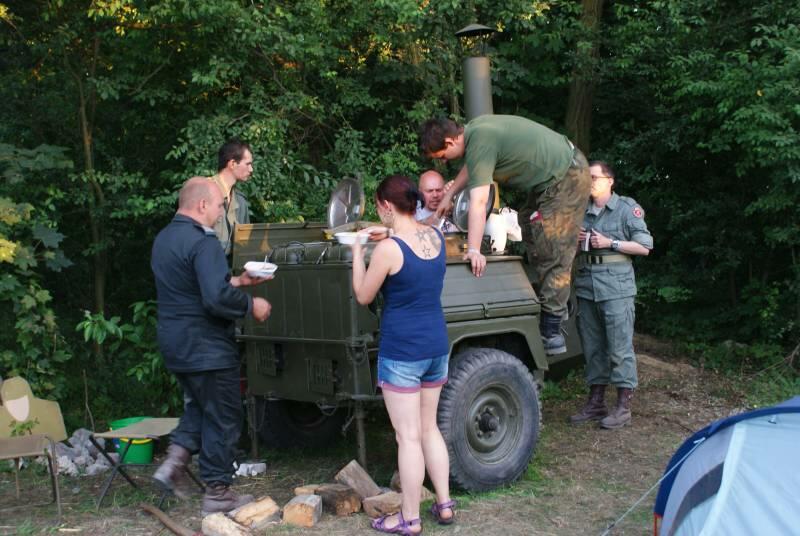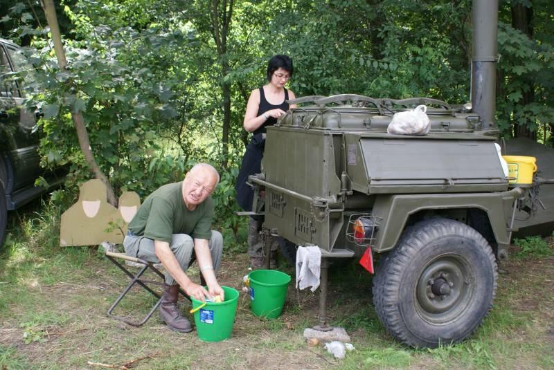 Oczywiście też ciężko pracowaliśmy ;) . Jacek ciągle coś „grzebał" w BRDMie, ROSOMAKI robiły ćwiczenia polowe, Bodek, Michał i Czarek robili sesje zdjęciowe w mundurach, w plenerze, Hightower zdobywał szlify na Uazie pod okiem Maćka, patrolowano teren w mundurach, sprawdzano właściwości bojowe BRDMa, a Dawid zbierał kolejne rzeczy do kolekcji. Pod wodzą Kazia gotował się obiad w kotłach i prawie każdy miał przydziałowe 15 minut obierania kartofli lub mieszania potrawy. Asia z Krisem nie dość że załapali się na obieranie ziemniaków, to ich niedzielny, krótki postój w okolicach kuchni polowej, skończył się przydziałowym myciem kotłów - oczywiście „na ochotnika" ...